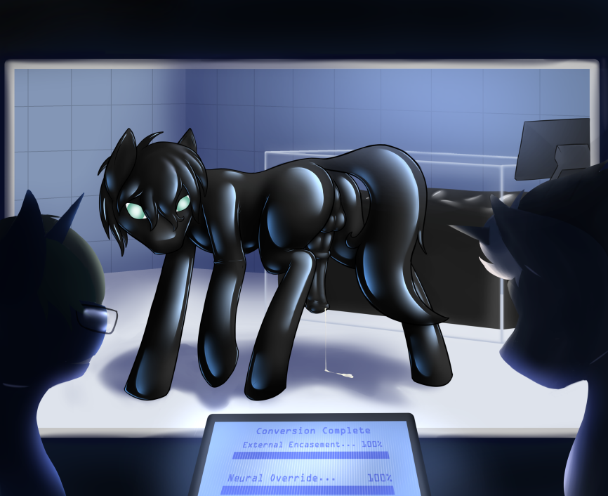 昏暗的牢房,没有一扇窗户,仅有扇可容小马通过的铁门,没有刑具或是刑马,取而代之的是三匹不同肤色的角马在一张木桌上倒腾着奇怪的研究器材,而被研究的正是琉璃。